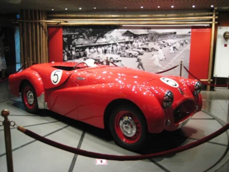 | マカオグランプリ博物館に入るとまず目に飛び込んでくるのが真っ赤なトライアンフTR2。1954年に開催された第一回の大会で香港人ドライバー、エディ・カルバルホが駆り優勝したマシン。 第一回大会は元々マカオ在住の3人の愛好家が街での宝探しゲームを企画し、香港モータースポーツクラブのポール・ヂュトワに助言を求めたことから始まった。デュトワ氏はモナコGPに似たコースにすることを提案。それに乗った愛好家たちは警察署長の許可を取り付け、レースを開催した。日本で鈴鹿サーキットが初の本格的サーキットとして産声をあげたのが1962年だから、それ以前からマカオでこんな公道レースが行われていたとは驚きである。 |