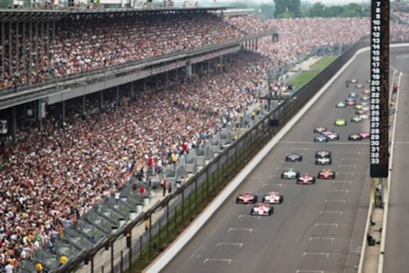 | 40万人の観衆を集めるアメリカ最大のモータースポーツイベント「インディ500」ではサーキットのオーナーである女性、メリー・ハルマン・ジョージがスタートコマンドを発するのが定番。また戦没者追悼記念日の週に開催されるため、セレモニーの中でコメディアンでシンガーのジム・ネイバーズがインディアナ州の兵士の歌である「Back Home Again In Indiana」を情感たっぷりに歌うのも定番である。なお、この曲はルイ・アームストロングなどが演奏するジャズスタンダードとしてもおなじみだ。毎年同じ人が同じことをやっても盛り上がるのだ。 【写真提供:本田技研工業】 |