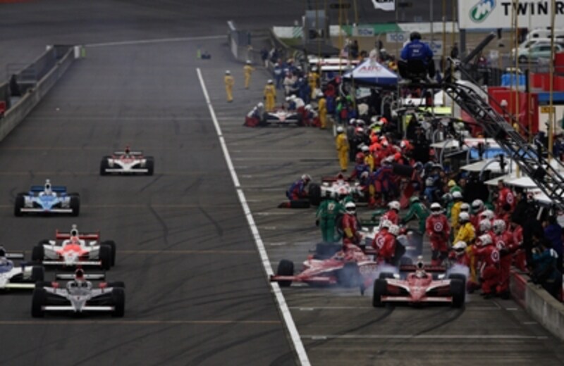 | コーションラップ中にピットレーンがオープンになると給油、タイヤ交換のためにマシンが一挙にピットインしてくる。レース終了までの燃費の計算をし、このあとのレース中にコーションが出る可能性も加味しながらカケに出て、ピットインしない=ステイアウトするドライバーも出てくる。この作戦の違いがレースの結果をさらに面白いものにするので、誰がどのタイミングで入ったかステイアウトしたかはキッチリと把握しながら観戦したものだ。 【写真提供:MOBILITYLAND】 |