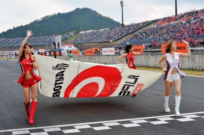 | 大観衆に手を振りながら行進するSUPER GTのイメージガール達。「SUPER GTが無くなれば、日本のレース界は終わる」と言われるほど、SUPER GTは国内レースで唯一華やいだ存在だ。新しい世代のファンも獲得している。 【写真提供:SUPER GT.net】  |