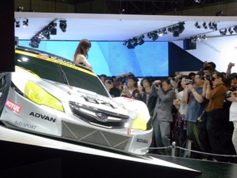 | 東京モーターショーでも展示されていた「レガシィB4」のGTマシン。注目して欲しいのはキャンギャルか?GTに挑戦するマシンか?見せ方が違うような気もするが、これが世の中の現実でもある。 |