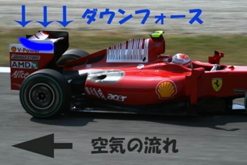 飛行機の理屈と全く逆で、レーシングカーの得る「ダウンフォース」も低速ではあまり効果がなく、高速になればなるほど強くなる。「ダウンフォース」の効きを強くするためには飛行機の着陸時同様に翼を大きくすれば良いのだが、レースの場合は車両規定で翼の寸法は決められており、レース中に大きさを変化させることもできない。