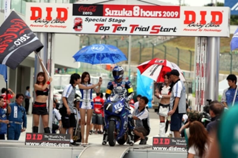 | 鈴鹿8耐の決勝グリッド上位10台を確定する「トップテントライアル予選」。1台がコースを独占してアタックする。耐久レースなのでグリッドの位置はそれほど大きくは影響しないが、エンターテイメントとして楽しめる部分も鈴鹿8耐のお祭り的要素の一役を担う。こういった予選方式はF1でもかつて採用されたが、その起源は鈴鹿8耐だという説もある。 【写真提供:MOBILITYLAND】 |