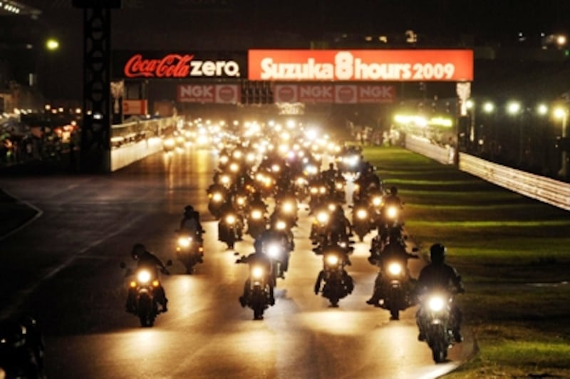 | 鈴鹿8耐の土曜夜に開催される「前夜祭」では恒例の「バイクであいたいパレード」が開催される。全国から800台のバイクが参加し、鈴鹿市内をパレードした後、夜の鈴鹿サーキットを走行する。 【写真提供:MOBILITYLAND】 |