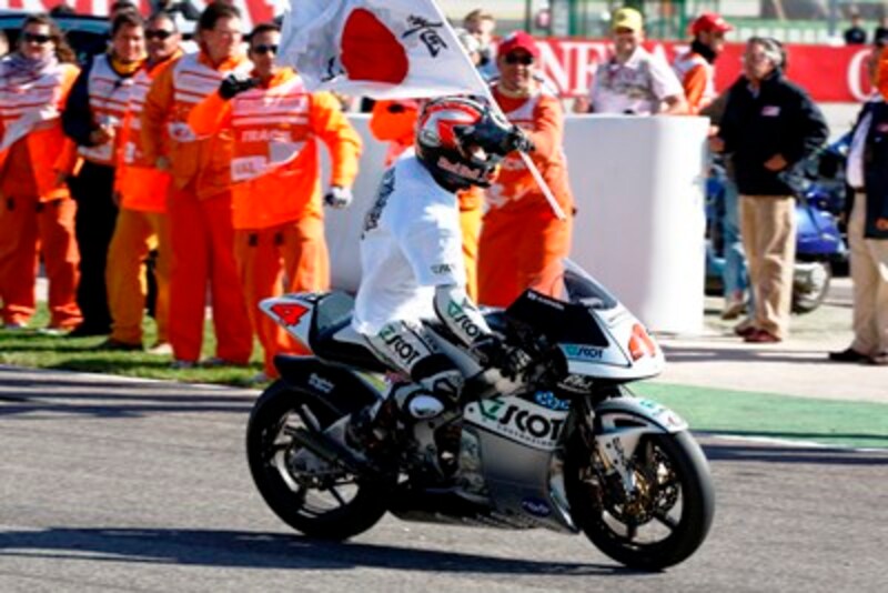 | 世界チャンピオンを決定し、スペインの観客から祝福されウイニングランをする青山博一。 【写真提供:本田技研工業】 |