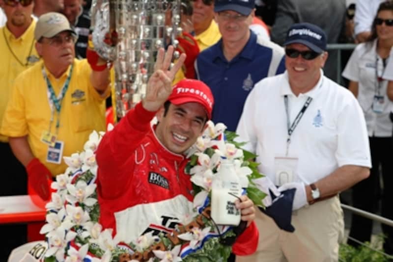 | 「インディ500」では、ウイナーはシャンパンファイトをするのではなく、ミルクを飲むのが伝統。ミルク飲みでまたスポンサーから賞金が出ます。 【写真提供:本田技研工業】 |