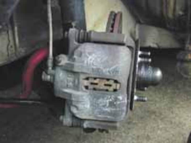 ブレーキというと尻込みしがちですが、誰でも簡単にできるのがディスクブレーキの残量チェックです。ディスクブレーキというのは、円盤状のディスクローターをブレーキパッドではさんで制動するタイプで、今のクルマ(トラックなどは除く)のフロントブレーキは全部これです。放熱性が良く、効きが安定しているのが特徴で、スポーティなクルマや重量級ではリヤでも使われてます。もう一つ、ブレーキ液の量も大切ですが、これは次回にしたいと思います。