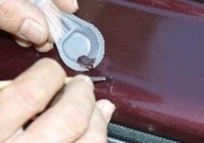 筆先に滴り出た塗料を、キズ溝の中心めがけて垂らすような感じに塗布する。塗るというよりも埋めるといった感じで、周囲にはみでないようピンポイントで塗り付けるのがコツだ。