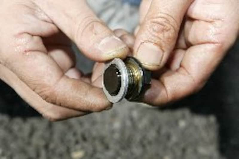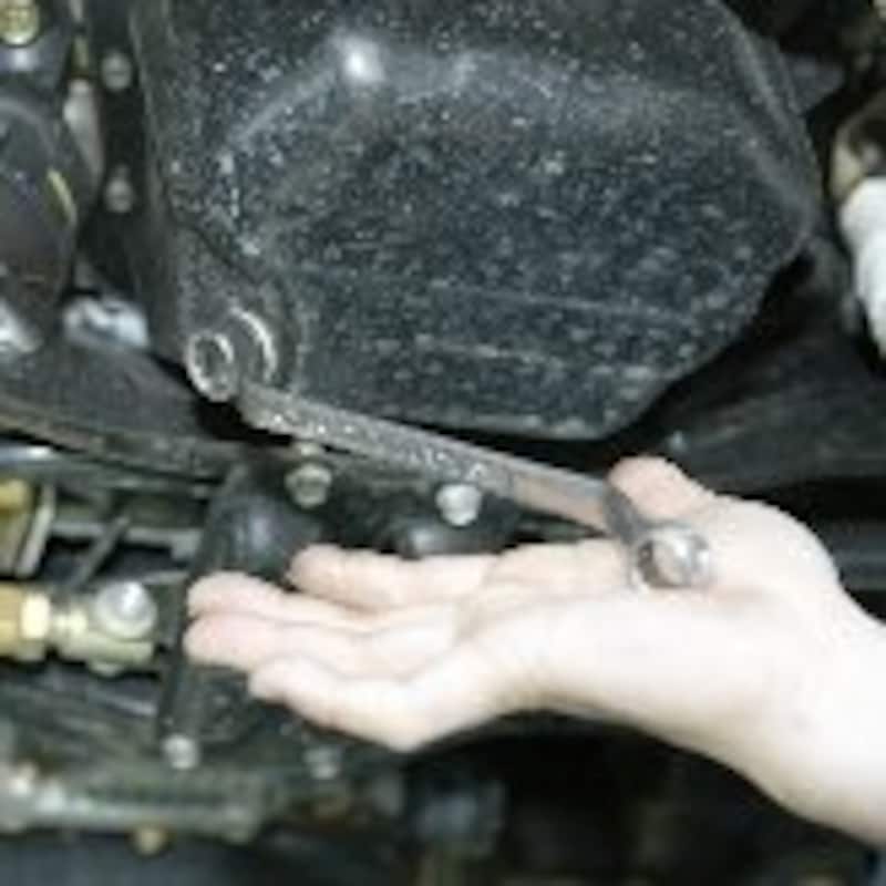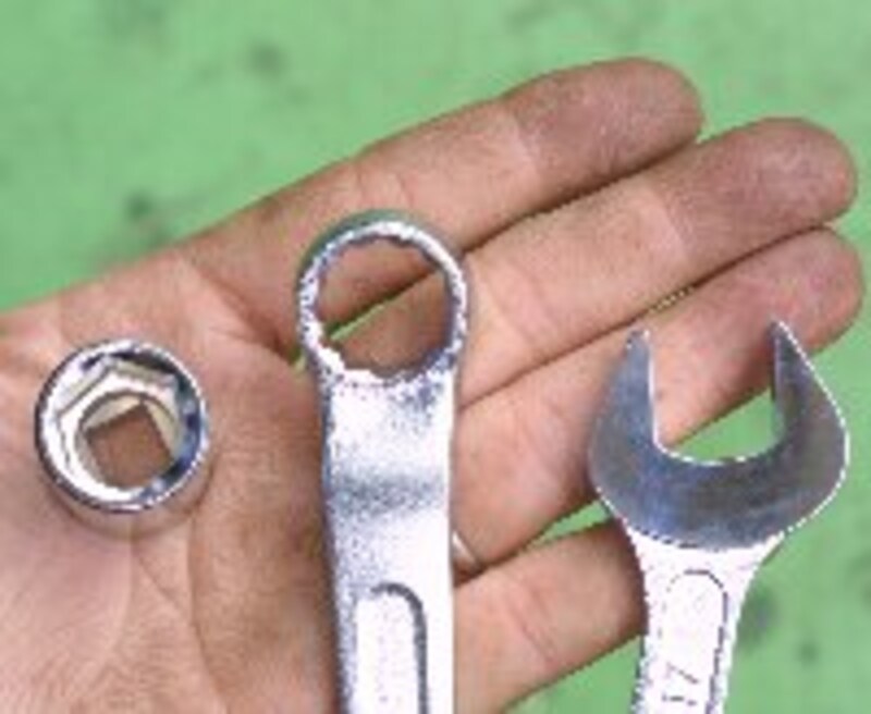 ドレンボルトは固く締まっているため、スパナを使用すると角がつぶれて外れなくなってしまう。このため、メガネレンチもしくはソケットレンチの使用が原則!また、力任せに回しても緩みやしない。レンチのヘッド部分を外れないよう押さえつつ、ハンドル部を叩くような感じに一気に力を加えるのがコツだ。ただし、中途半端に叩くと緩まないばかりか手が痛くなるので注意。思い切って叩くこと肝心だ。
