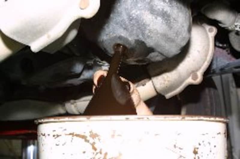 ドレンボルトが緩んだなら廃油受けをドレンの下に配置し、ドレンボルトを素手で押し付けるようにしながら回していき、ネジ山が外れたところで一気に取り外す。なお、オイルは放物線を描いてけっこう遠くまで飛ぶので注意!