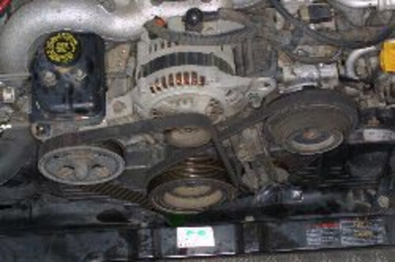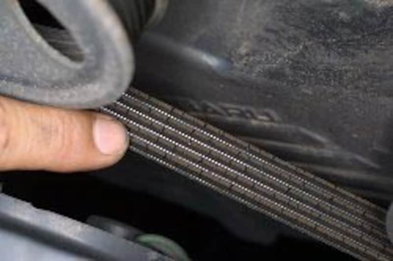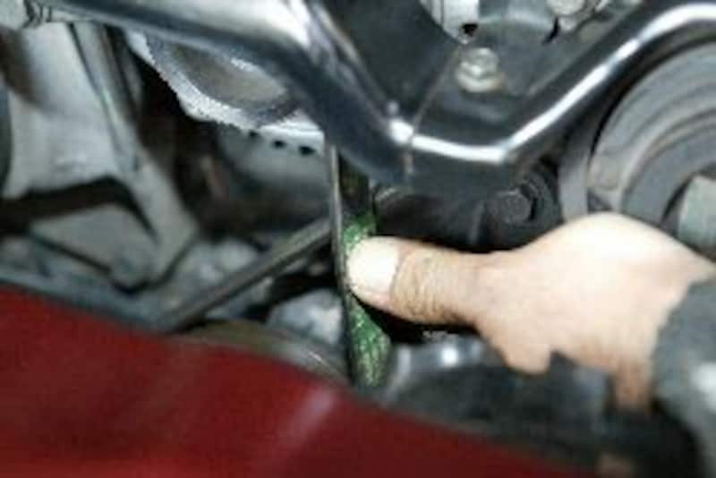 油圧ポンプが判別できたら、駆動ベルトがかけられているプーリーとプーリーの中間付近を指で押してみる。目一杯押したときに10~15mm前後たわむ程度なら張りはOK。ブヨブヨしていたら調整が必要だ。7.ベルトの裏面を確認する