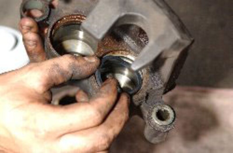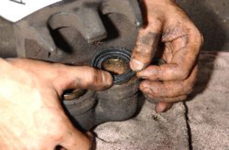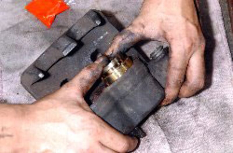 ピストンの先端部がシリンダー底部に接して止まるまで、キャリパーホディにまっすぐ押し込む。正常ならスムーズに入るが、途中で固くなって入らなくなったときは傾いてるため、一度外してやり直す必要がある。10.ピストンブーツをセットする