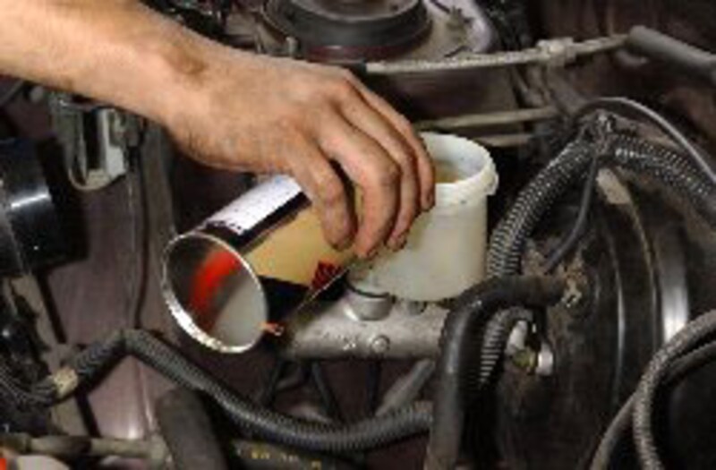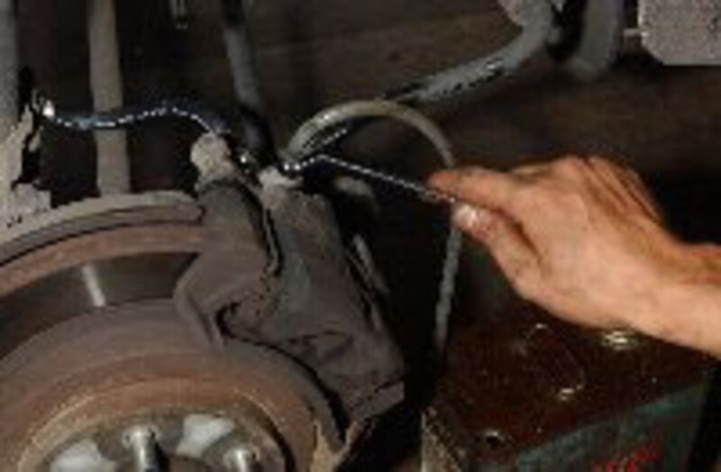 エア抜きは基本的に2人1組みで行う。まず、ブリーダーボルトに透明なホースを介してキャッチタンクを接続。助手に運転席に座ってもらう。その助手にブレーキペダルを数回ポンピングしてもらい、踏み応えがでてきたところで踏み込んだ状態で止めてもらう。その瞬間、ブリーダーボルトを緩めると、エアが勢いよく抜けてくるので、排出圧が弱まったらただちにブリーダーボルトを締め付ける。この一連の作業を、ブレーキフルードを補充しながらエアが出てこなくなるまで繰り返すのだ。が、作業中リザーバータンク内のフルードを空にしてしまうとエアが混入して一からのやり直しとなり、エアが抜けきれたかどうかの判断も慣れないと難しい。ハタから見ていると簡単そうだが、キッチリ行うためには経験が必要となるのだ。