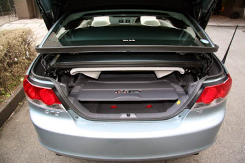 また、ラゲッジスペースに、興味深い独自の機構を採用しています。ルーフを閉じた状態であればゴルフバッグ3つを積載可能で、ルーフを開けた状態では容量は半分ぐらいになりますが、トランクフードを開けて後端のスイッチを押すと、畳まれたルーフが上に持ち上がり、荷物を出し入れできるようになっています。これは重宝します。