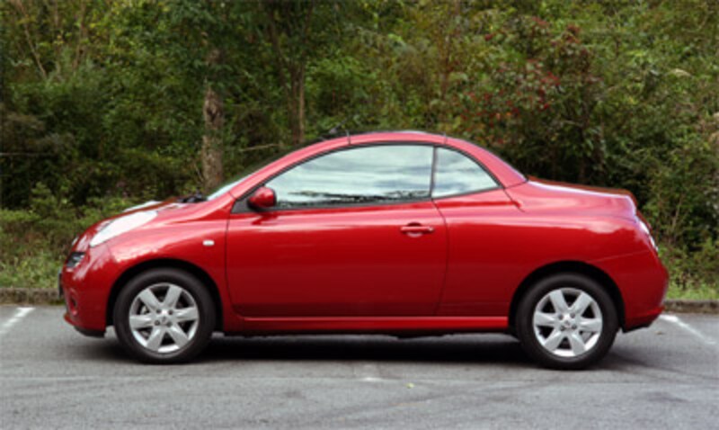 正体は「マイクラ C+C」。英国日産で生産されるマーチ=海外名マイクラをベースに、リアセクションにカルマン社製の電動開閉式ハードトップを架装したという成り立ちです。