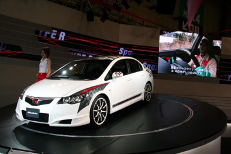 ホンダでは、純正用品「モデューロ」ブランドの今後の方向性を示すコンセプトモデルとして、「スポーツ・モデューロ・TYPE R」が参考出品されました。昨年のスーパー耐久レースへの参戦により培ったテクノロジーをフィードバックし、「実効空力」のコンセプトに基づいたエアロパーツを装着しています。