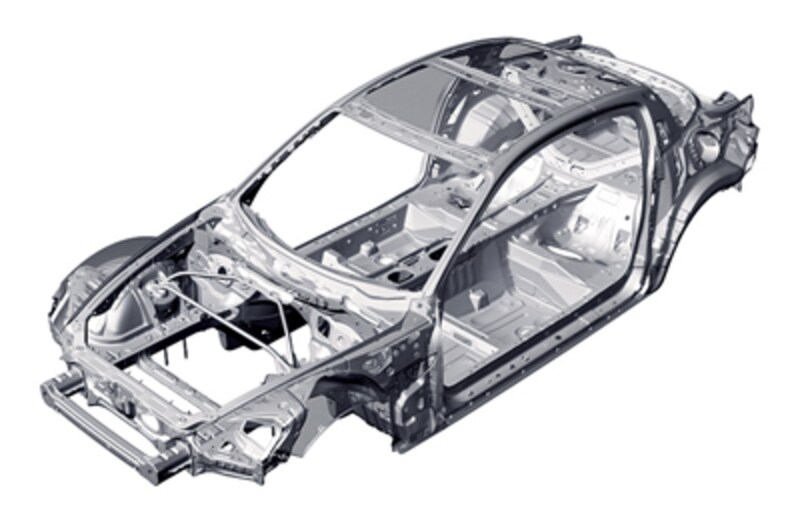 | もともと高剛性だったボディがさらに進化。左右フロントサスタワーとダッシュカウルパネルを結ぶ台形ストラットタワーバーをMT車に採用したほか、板厚をアップ。そのほか、助手席インパネメンバーの結合強化、フロントドア開口部ヒンジピラーにスポットウェルボンド追加などを実施。従来モデルに比べ、ねじり剛性5.4%、曲げ剛性8.7%向上 |