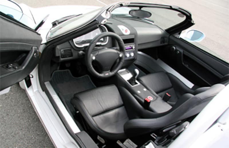 コクピットは、このクルマがモノコックではなく、アルミのスペースフレームで骨格を形成していることは一目瞭然。シートはバケットタイプで、コクピットは今どきのクルマとは一線を画するシンプルな構成となっています。