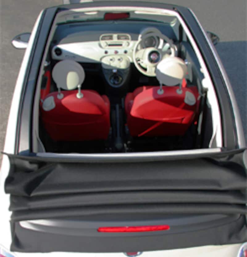 フルオープンにするとこのようになるが、後方視界が損なわれるのが難点ちなみにベース車も同様ですが、このクルマは安全装備が充実しているのも特徴です。加速時のホイールスピンを制御するASR(アンチスリップ レギュレーション)や、シフトダウン時のエンジンブレーキトルクを制御するMSRモーター シュレップ レグルング)、緊急制動時にブレーキペダルの踏力が足りない場合、通常よりも高い制動力を発揮するHBA(ハイドローリック ブレーキ アシスト)など、これらを統合制御するESP、坂道発進をアシストするヒルホールドシステムなども備えています。さらに、クラス初のニーエアバッグなど7エアバッグを標準装備するほか、ESS(緊急時制動表示機能)も備わります。フィアット500は、このクラスのクルマとしては、やや価格が高めのような印象もないわけではなく、こうした趣味性の高いクルマゆえ、それもやむなしという捉え方をされている面もありますが、実は装備自体が非常に充実しているのです。それでこの価格なので、むしろ買い得があるのではと思うほどです。
