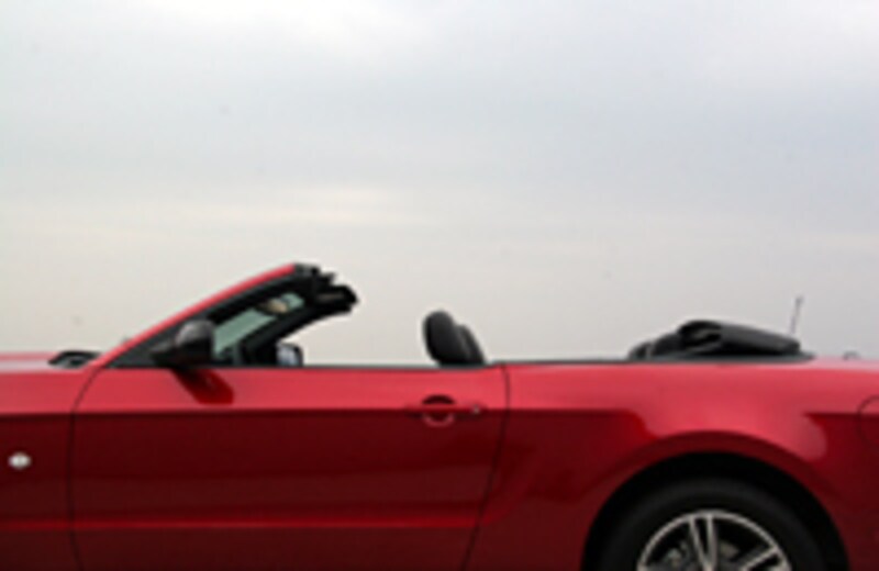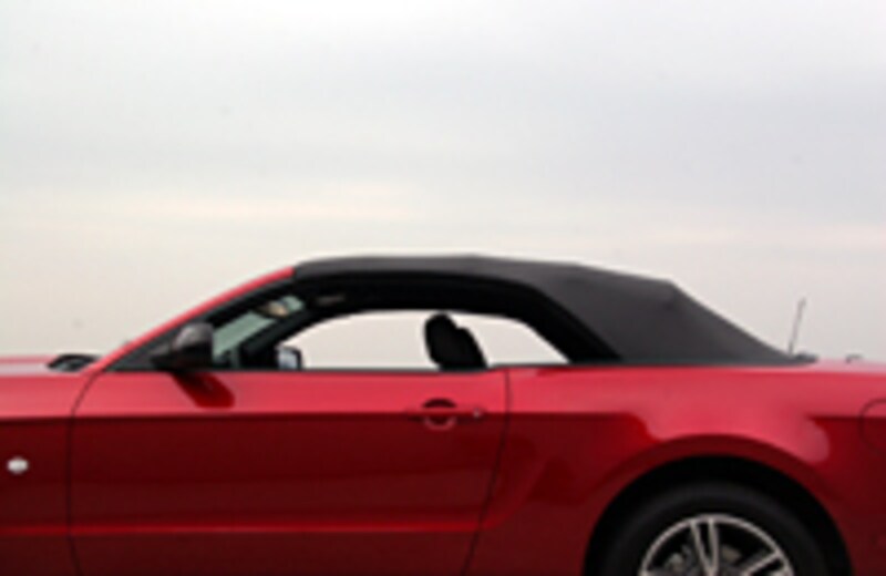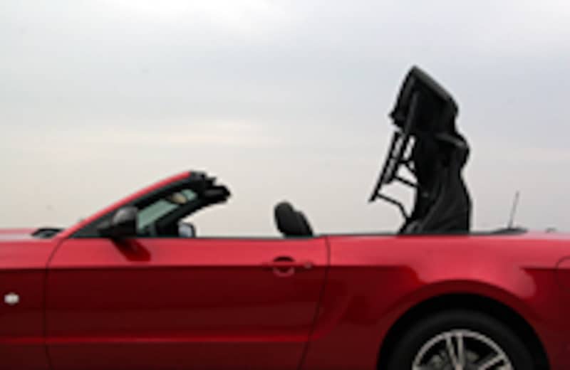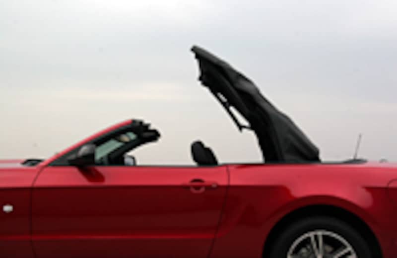 ドライビングポジションからの眺めでは、エンジンフードのパワードームが印象的。今回試乗したのはコンバーチブル。ソフトトップには、これまでどおり5つ折りのZフォールド・トップが採用されています。オープンにするには、フロントスクリーンの上端の左右のレバーを開放し、ルームミラーわきのボタンを押せば、あとは電動で、わずか約13秒でキャビンは景色と一体となるのです。