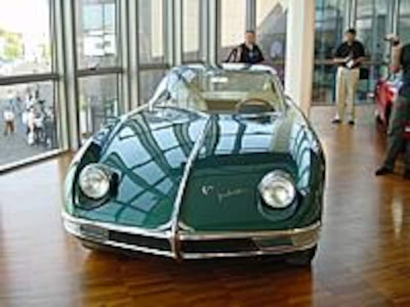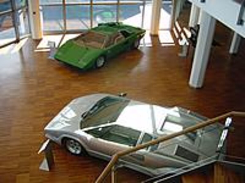 全面ガラス張り、フローリング仕立ての明るいミュージアムの中は、2フロアあって、2階にはマニア垂涎のランボルギーニ1号車(日本人所有)や数々のF1マシンなどをたくさん展示。螺旋階段を下りた1階には、カウンタックプロトタイプやカウンタックアニバーサリー、LM002などに加えて、貴重な資料やエンジンなどが飾られています。