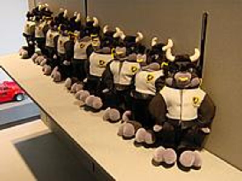 ランボオーナーでない僕もマスコット人形とミニカーをゲットしてしまいました。(正規代理店のミツワでもいくつかは買えるようです)ショップを出て左に行くと、平屋のファクトリーが並びます。玄関を背に右側に生産ライン、左に従業員食堂やマリーン事業部などがあり、突き当たりはレストアショップ、その横がカーボンマテリアル工場と開発部門、というのがおおよそのレイアウトです。