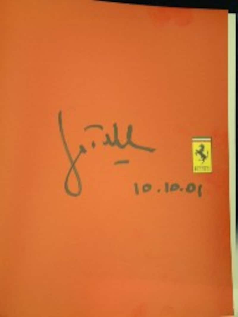 で、12時からマセラティの発表会。僕は間に合わなかったけど、様子は変わりの人間が撮影してくれた。何でもバリチェロとトッド監督が登場したんだとか。ウワサでは影にシューマッハもいたとかいないとか。だって、夕方開かれたブリヂストンのパーティにはいたもんね。この3人。 会場には甘糟りり子さんの姿も。フェラーリファンということで、トッド監督のサインをゲットしていた。いいなあ、欲しいなあ。これがそのサイン。
