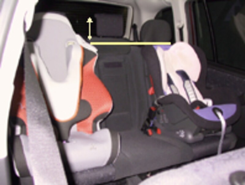 そのため例えば3列シートモデルの3列目に装着を考えている人は、とくに注意が必要。最近のクルマの多くが、3列目は視界をよくするために、シートの座面高が高められていて、なおかつデザインの問題などでルーフ高が低かったりしてヘッドクリアランスが少ない場合があるから。今回はスバル・トラヴィックの2列目に装着をしたのですが、それでもそんなに余裕はなかったです。実は後でお話しますが子供を乗せる際に、この高さがまた問題になったりもするんです。