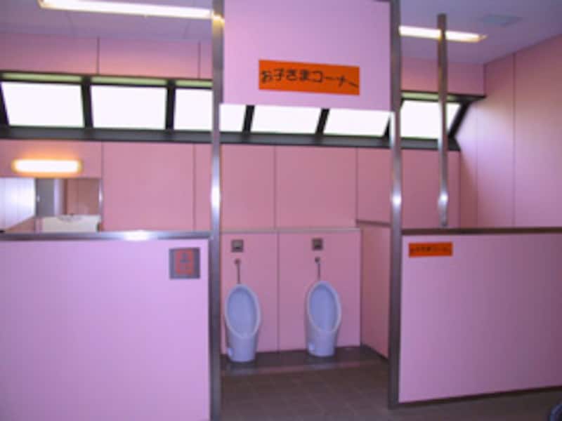 写真で見てもわかるように『おこさまコーナー』というのがあり、ここには子供が一人で入れるような子供用個室(ドアを閉めても、大人が上からのぞけるようになってまい)や男の子用のトイレも3個用意。さらにオムツ替えベビーシートが2台用意されていました。