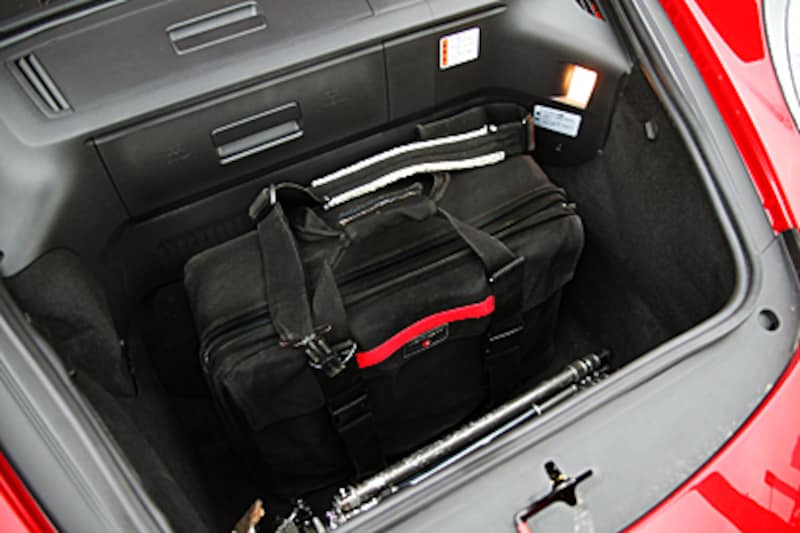 | トランクも実用レベル。56×41×20cmの大型のカメラバッグ ライトウェア1420と高さ70cmの三脚ジッツォを入れてみたが、まだ中型と小型のバッグくらいなら一つずつ入りそうだ。 撮影:松本明彦 |