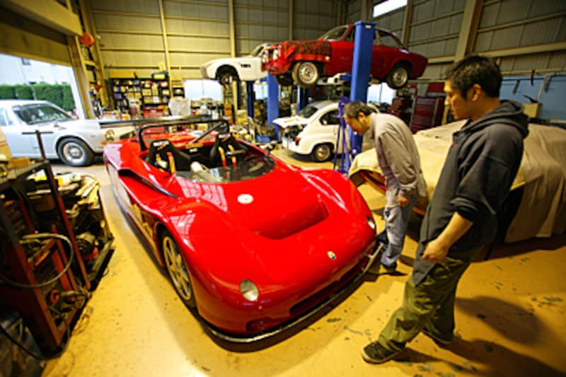 | イタリア車の整備工場「ガレージ岡田」にて。手前が岡田さん、奥がTさん。オスカ、アバルト等、レアなイタ車が並んでいる。 撮影:松本明彦 |