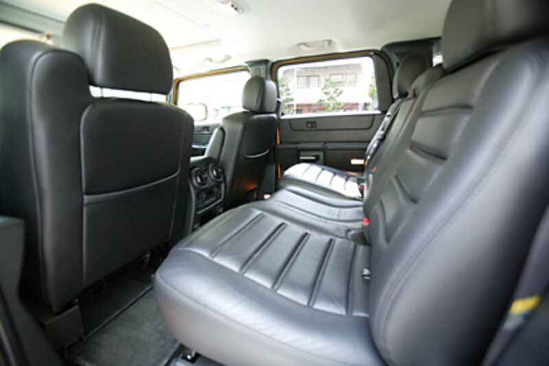 オーディオにはBOSEを搭載し、素晴らしい音響空間を提供してくれる。リアにはヘッドフォン付きオーディオコントロールも装備。デュアルゾーンのオートエアコンやセカンドシート用のエアコンの噴き出し口も備える。意外に乗り心地も良く、H2の室内で過ごす時間は心地いい。