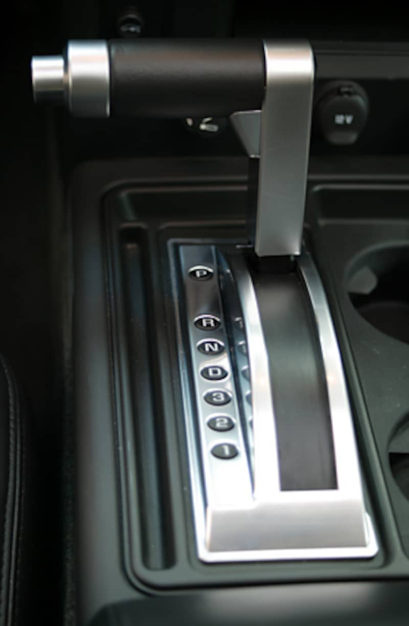 インテリアでは、まずガングリップタイプのシフトレバーが目を引く。操縦桿を想起させるミリタリー・ルック。余白の大きい大雑把なインパネはいかにもアメ車だが、よく言えばおおらかさがある。加えて広い室内幅と立ったサイド、フロントガラスのおかげで、広々と快適だ。