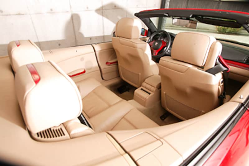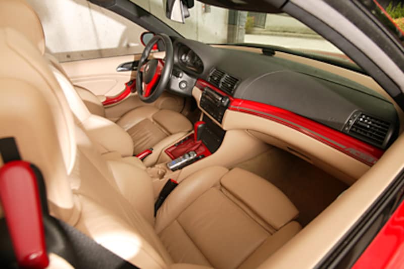 もちろんただのBMW330カブリオレではない。「手を入れたところですか?ホイールは19インチ、タイヤは幅広にオーバーフェンダー、M3ボンネット、ボディはフェラーリレッドのロッソコルサに全塗装、リップをつけてサイドスポイラー、サスペンションも変えました。ブレーキはAPレーシングの4POD、キャリパーも赤に塗って、マフラーは4本出し、エンジンルームにはタワーバーを入れてコンピュータチューニングしています。インテリアはパネルを赤に、ペダルはアルミ、ステアリングも変えてSMGに……」と凄い!ドレスアップとチューニングだけで、もう一台BMW3シリーズが買えてしまうほどだ。