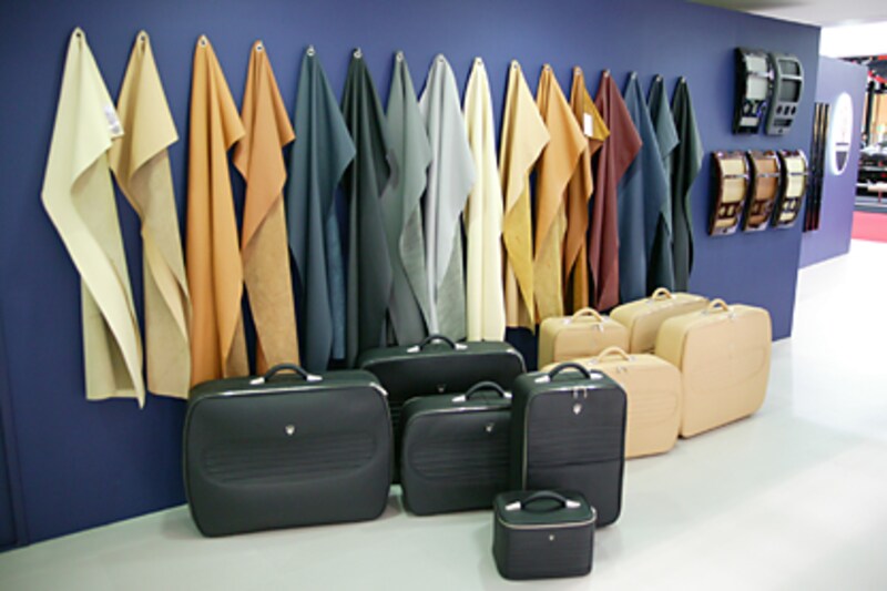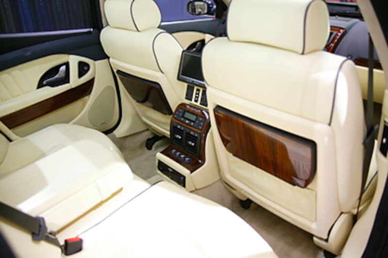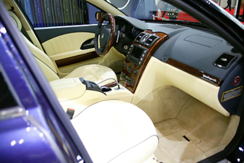 | クアトロポルテのインテリアは10色のレザーにダッシュボードカラー(10色)、ステアリングホイール・カラー(10色)、ステッチ(13色)、ルーフ・ライニング(3色)、カーペット(4色)、さらにウッドはローズウッド、マホガニー、ブライアーウッドの3種類に、チタン・スタイル・フィニッシュのオプションの設定もあり、数百万通りもの組み合わせの中から、世界でたった一台の自分だけのクアトロポルテを創る事も可能だ。手前に並ぶのは、クアトロポルテのトランクに、ちょうど納まるように作られたフルレザーのラゲッジセット、441,000円。 |