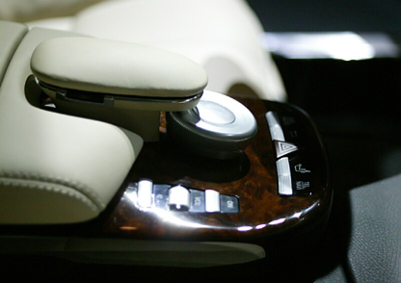 | 全長×全幅×全高は5075(5205)×1870×1485mmで、ホイールベースは3035(3165)mmと、先代と先々代W140の丁度中間のサイズだ。(括弧内はロングホイールベース車)。 グリルもプランヴュー(上からの平面図で見て)でより角度を付け、サイズも大きくなっている。フェンダーアーチも特徴的だ。 |
