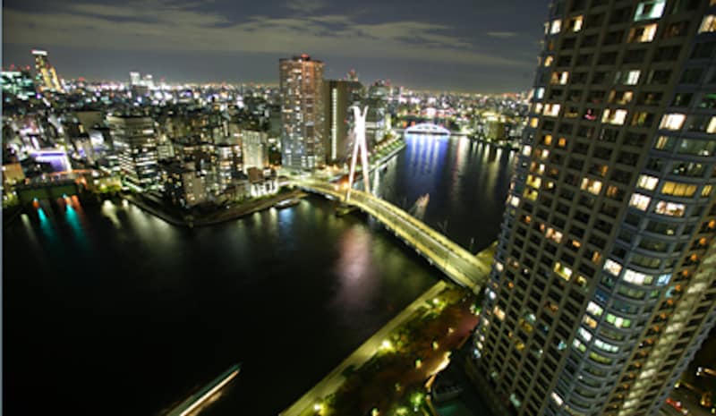 | 部屋のベランダの、眼下に広がる東京のリバーサイドの夜景。 |