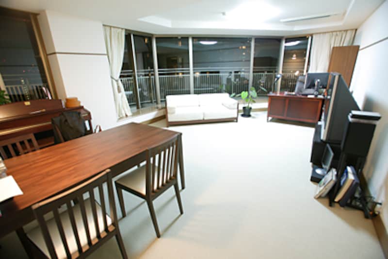 | 広がりのある、扇形のリビングルーム。片隅にはピアノが。 |