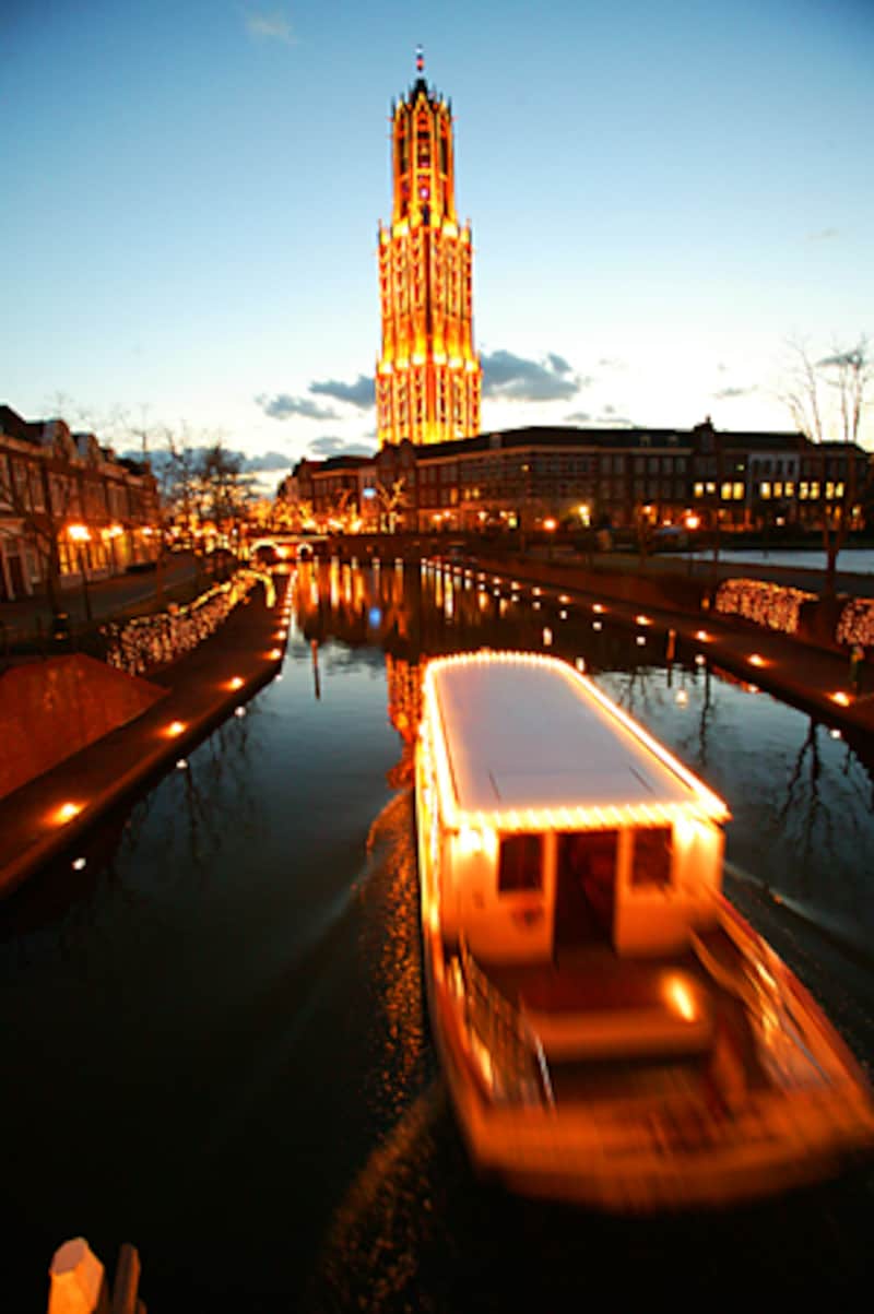 | 夕暮れになり、明かりが灯り始めると、水面にもその明かりが揺れる。正面にはスパ「RINウェルネス」が入る「ウェルネスセンター」とランドマークタワーの「ドムトールン」。湖の両岸には、コテージが並ぶ。 |