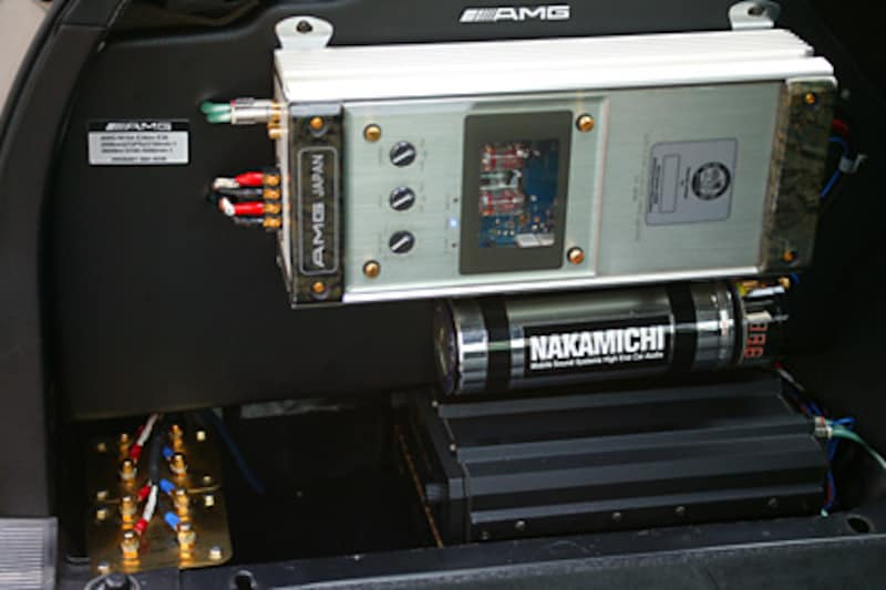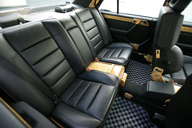 メルセデス選択の理由は「安全性です。つぶれていい所といけない所をきちんと作り分けるなど、何十年もの安全性の蓄積が違います」。E500-5.8は、まずエンジンを5.8Lに換装、マグネシウムホイールは26万円/1本(!)、専用のブレーキシステム、オリジナルマフラーなど。インテリアはジャーマンレザーのレカロ2脚に、ウッドパーツを純正のウォールナットブラウンからホワイトバーズアイウッドに変更。さらに、プラスティックや金属パーツだった所も、この天然のホワイトバーズアイウッドに変更されている。