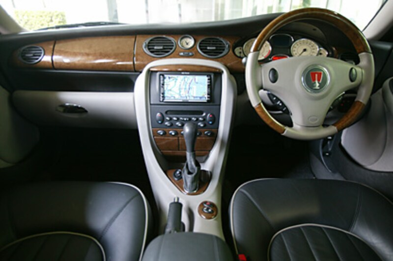 | ローバー75のインテリアはウッドとレザー。英国高級サルーンの文法通りだ。 |