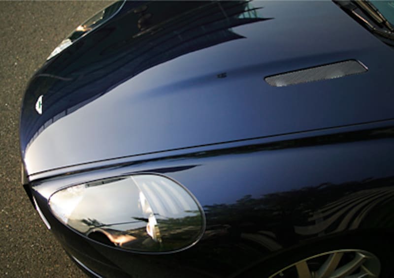グッと後退角の付いたヘッドランプは、DB9のデザインの最大の見所の一つ。フロントフェンダーの、カットラインや接合ラインを不要としたその「シングルカット」ヘッドランプ開口部は、ハンドメイドならではのものだ。