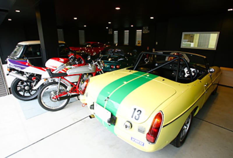 ガレージに佇むのは、ディーノ246GT、MG A、MG B、ロータス エリーゼ シリーズ1、ローバー ミニ クーパー仕様、それにバイクはNSR、ドリーム50。ここは横浜市にお住まいの、石井修二さんのガレージだ。