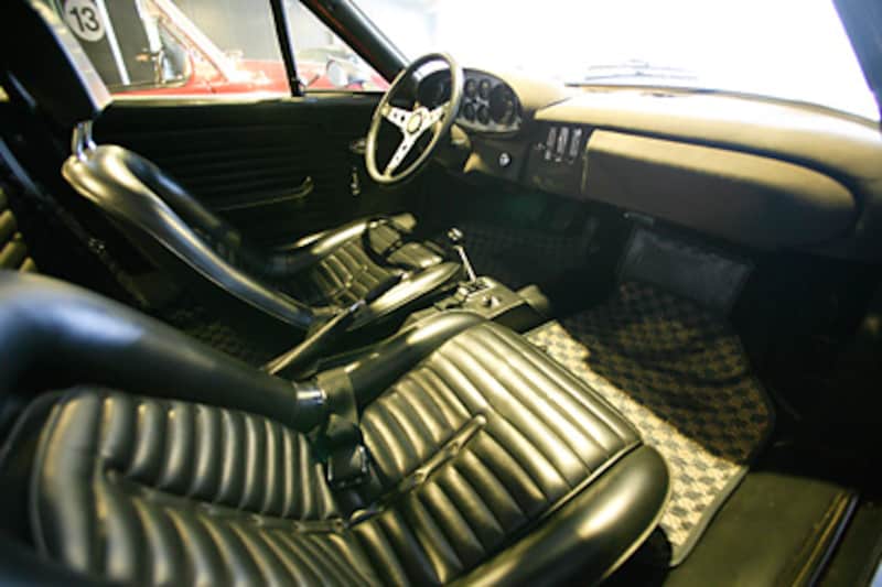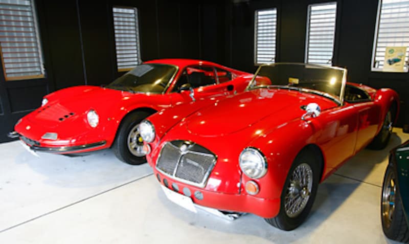 | 「晴れた日には、ディーノで箱根を走ります」と石井さん。手前のMG Aも「ゆっくりツーリング用」。ガレージの黒い壁や天井に、クルマが映える。 |