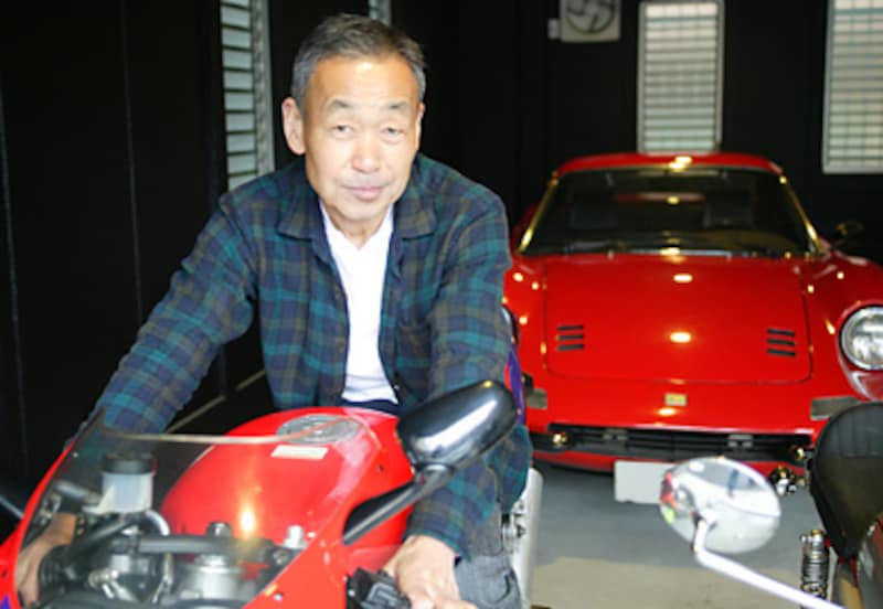 | NSRにまたぐ石井さん。奥にはディーノ。実はディーノも4235×1700×1135mm(全長×全幅×全高)、ホイールベース2340mmの5ナンバーサイズで車重は1080kgと、現在のフェラーリに比べれば遥かに小柄で軽量なボディだ。 |