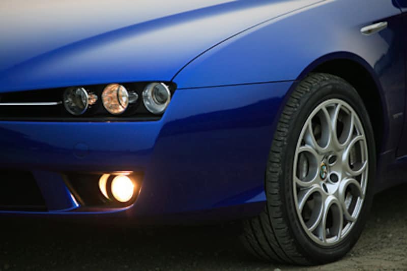 キャビン上屋からAピーラー、そしてボンネットパワーバルジにかけてのラインは、そのままバンパー下部まで大きく縦断するアルファ ロメオグリルに繋がり、大きなV字を描く。ボンネット上に膨らみを付けたアルファ ロメオマークや、中心に向かって細くなる左右のヘッドランプ部グリルと共に、ボディ中心下部に視線を集中させ、前進感と安定感を強調する。サイドのキャラクターラインはそのすぐ下の面をえぐり凹面とし、ショルダーとホイールアーチの張り出しを強調。サクッとナイフで斜めにそぎ落としたようなフロントフェンダーは、159同様ブレラのデザインの見所の一つだ。