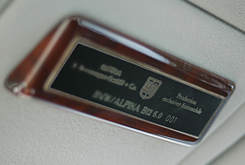 そして2台目はアルピナブルーのB12-6.0。ラグジュアリーセダンBMW 7シリーズが、アルピナの手によって、さらに特別で豪華なレザーとウッドのインテリアに仕上げられている。たとえばフルレザーのダッシュボード。ドア、ピラーやシートバックのウッドトリムなど、細部にわたり全てがアルピナオリジナルのものだ。