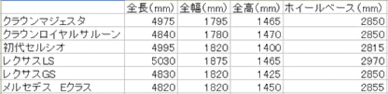 マジェスタのサイズは、4975×1795×1465mm(全長×全幅×全高)、ホイールベース2850mm。他車と比較してみよう。