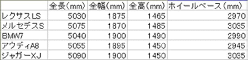 満を持して、レクサスLSが発表された。ライバルはメルセデスSクラス、BMW7シリーズ、アウディA8、ジャガーXJなど、世界に冠たる最高級車達だ。まずそのサイズを、標準ボディで比較してみよう。