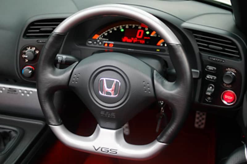 | スピードはデジタル、タコはグラフ表示のメーター。VGSは、ハンドルの操作量が同じでも車輪の切れ角は、低速時には大きく、高速時には小さく連続的に変化し、取り回しの良さと回頭性、高速安定性を両立させた。プッシュボタンのエンジンスターターは、気分を盛り上げるが、咄嗟の時にセンターコンソールのハザードと間違えやすいので、カラーや形状、サイズをハザードとは変えるべきだろう。 |